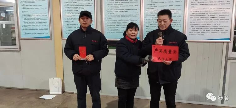 隨后,王副總公布了獲得產(chǎn)品質(zhì)量獎(jiǎng)的獲獎(jiǎng)名單:孫文孝,趙勇,范慶新,李長(zhǎng)環(huán),孫濤,劉淵,張進(jìn),徐波,陳士柯,朱濤,魯克峰,郭馨濤,陳騰飛,趙宗萬(wàn),陳新躍,陳維貴,張玉忠,蔣學(xué)良,梁立云,王西平,范文濤,郝尚強(qiáng),李長(zhǎng)禮,陳威傳,楊秀紅,王現(xiàn)軍,陳召明,王廣泛,張金廣,陳長(zhǎng)靜,王晨,李煥君,萬(wàn)文軒,共34人,每人獎(jiǎng)勵(lì)200元現(xiàn)金。部分奮斗在夜班崗位上的員工未能參加領(lǐng)獎(jiǎng)儀式,向他們表示辛苦了!